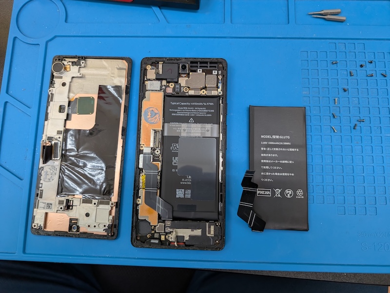診断の結果、原因はバッテリーの経年劣化でした。スマートフォンのバッテリーは充放電を繰り返すことで少しずつ劣化していくもので、Pixel 6a のような機種でも使用年数が経つにつれてバッテリー容量が低下していきます。そのまま放置してしまうと、突然電源が落ちたり、最悪の場合バッテリーが膨張して画面や本体に影響が出ることもあるため、早めの交換がおすすめです。