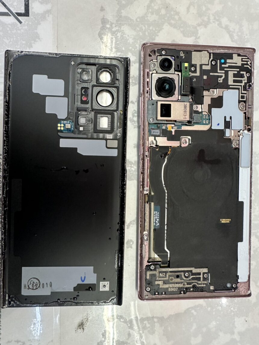 先日、Galaxy Note 20 Ultraが水没してしまったというお客様がご来店くださいました。水没は突然起こるトラブルですので、お客様も大変お困りのご様子でした。今回は水没修理をさせていただき、無事に症状が改善されました!ドナー機をお客様にご用意いただいたおかげで、スムーズに作業を進めることができ、作業費×2で修理完了となりました。施工時間は約2時間程度でお返しすることができました。